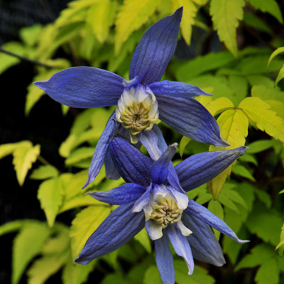 Первый сорт клематиса с золотисто-желтыми листьями, с которыми красиво контрастируют фиолетово-голубые колокольчикообразные, широко открытые цветки диаметром 5-6 см сложенные из 4-8 ланцетовидных чашелистиков. Цветет в конце апреля и в мае. Летом повторяет цветение, но оно уже очень скромное. С июня до осени декоративен причудливыми пушистыми плодами. Дорастает до высоты 2-3 м.Местоположение: солнце, полутень.