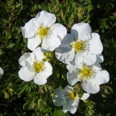 Лапчатка кустарниковая - цветущий, густой, неприхотливый кустарник. Цветет обильно, цветки разнообразной окраски: белые, желтые, розовые, малиновые. Листья светло-зеленые. Морозостойка.Эбботсвуд - листопадный кустарник высотой около 1 м с диаметром кроны до 1,3 м. Крона плотная, широкая, подушковидная ветви вертикальные. Листья светло-зеленые. Цветки белые, раскрываются в июне и сохраняются на кустах до конца сентября. Самый лучший белоцветковый сорт. Зимостойкость высокая.