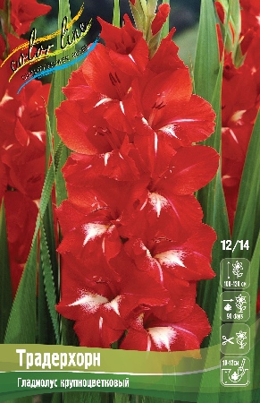 Гладиолус Традерхорм - многолетнее клубнелуковичное растение семейства Ирисовых. Высота 100-120 см. Цветки диаметром 10-15 см. Цветок имеет яркую красную окраску и бархатную структуру. Период цветения с июля по сентябрь.