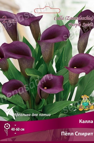 Калла Пёпл Спирит - изящный и нежный фиолетовый цветок с желтой серединой. Растение высотой около 40-60 см, диаметр цветка 8-12 см. Листья сердцевидные, темно-зеленые с белым крапом. Калла широко используется для озеленения: выращивания в открытом грунте и кашпо. Идеально подходит для срезки и букетов, стойкость в вазе до 20 дней. Каллы на зиму необходимо выкапывать и убирать на хранение при температуре +3+5⁰С.