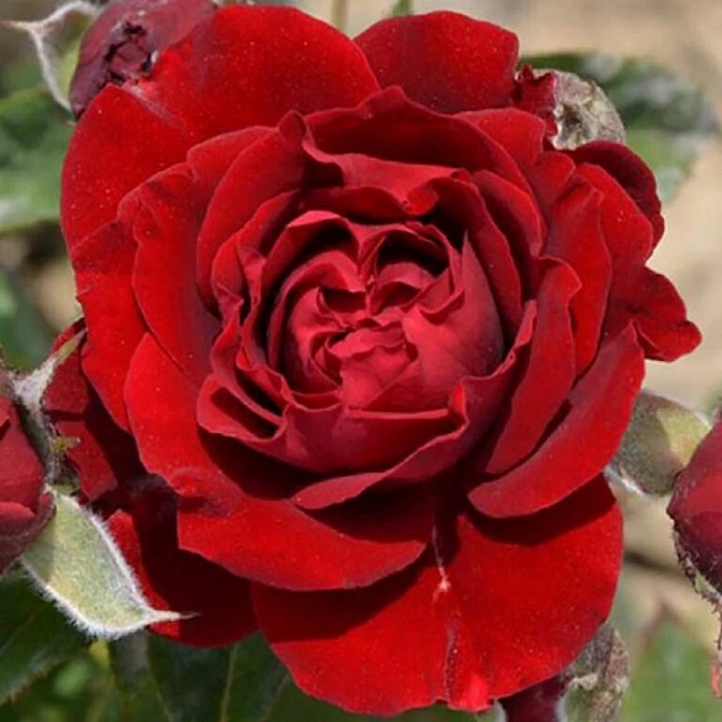 Цветки среднего размера (диаметром 6-8 см), махровые (в среднем 35 лепестков), чашевидной формы, бархатистые.