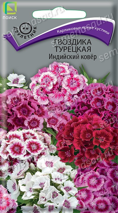 Гвоздика Индийский ковер турецкая Ц(Поиск)Очень привлекательная смесь карликовых растений. Кустик высотой 25 см. Листья линейно-ланцетные, зеленые. К концу 1-го года выращивания образуется розетка прикорневых листьев. На следующий год растения цветут с конца июня в течение месяца. Используют для сборных цветников, рабаток и для срезки.