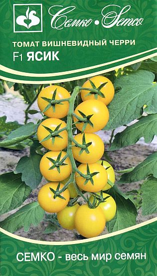 Томат черри Ясик F1 - ранний гибрид для защищенного грунта, индетерминантный, кистевой, LSL типа. От всходов до первого сбора плодов 90–95 дней. Растение среднеоблиственное, формируют в один или два стебля. Первое соцветие формируется над 9–11 листом. Кисть простая, плотная, с 8–15 плодами. Плоды округлой формы, желтые, гладкие, массой 20–30 г, среднеплотные, не растрескиваются. Уборку урожая проводят как кистями, так и отдельными плодами. Вкусовые качества отличные. Транспортабельный. Вкусовые и товарные качества плодов отличные, сохраняются без изменения потребительских свойств в течение 25–30 дней. Томат черри для защищенного грунта LSL типа Ясик F1 устойчив к вирусу томатной мозаики (ToMV). Используется для потребления в свежем виде и цельноплодного консервирования. Рекомендуется для выращивания в защищенном и в открытом грунте с подвязкой к опоре. Схема посадки 70х40 см. Урожайность свыше 12 кг/м2.