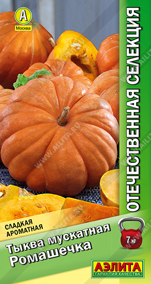 В серии собраны перспективные сорта и гибриды отечественной селекции.Высокоурожайный сорт с крупными сладкими плодами. От всходов до уборки 120-125 дней. Растения длинноплетистые. В средней полосе тыквы массой 5-7 кг, в южных регионах до 11 кг. Мякоть ярко-оранжевая, толстая (7-10 см), плотная, хрустящая, с ароматом моркови. Содержание каротина и сахаров повышенное. Подходит для любого вида кулинарии. Сорт устойчив к экстремальным условиям среды и основным патогенам. Хорошо транспортируется и хранится до трёх месяцев.